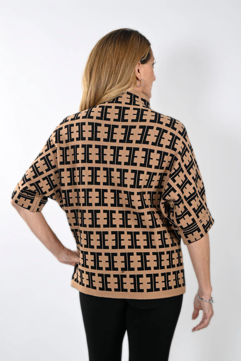 The camel/black knit top with letter print blends contemporary style with timeless comfort, featuring a chic color combination and a subtle letter design that adds a modern edge. This versatile piece effortlessly transitions from casual outings to more polished looks, making it a statement wardrobe essential for those seeking a perfect balance between fashion and ease.