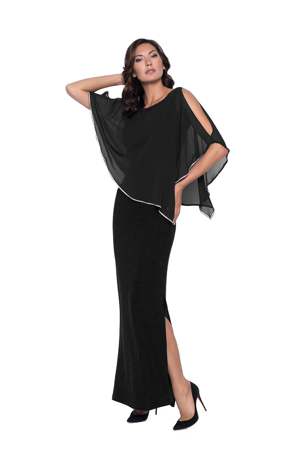 This Frank Lyman sheath maxi dress features a refined silhouette accented by a flowing chiffon cape, combining sophistication with striking style. The sleek design, enhanced by a graceful slit, delivers both elegance and ease, making it an ideal choice for formal events or refined casual wear. Crafted to balance comfort and visual impact, this dress is a timeless addition to any wardrobe.